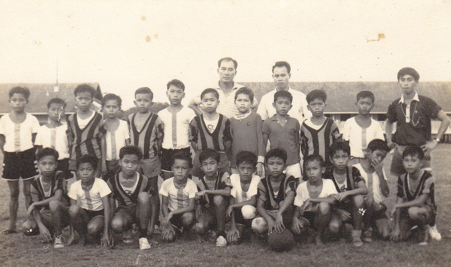 | MOOD (seen kneeling at the centre) as captain of the Bintulu Government Seconday School (BGSS) football team C in striped black and red jersey.........photo taken in 1965 |